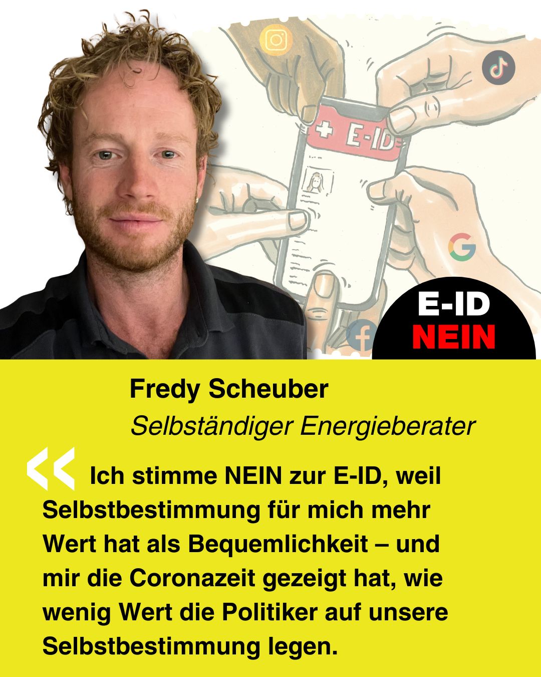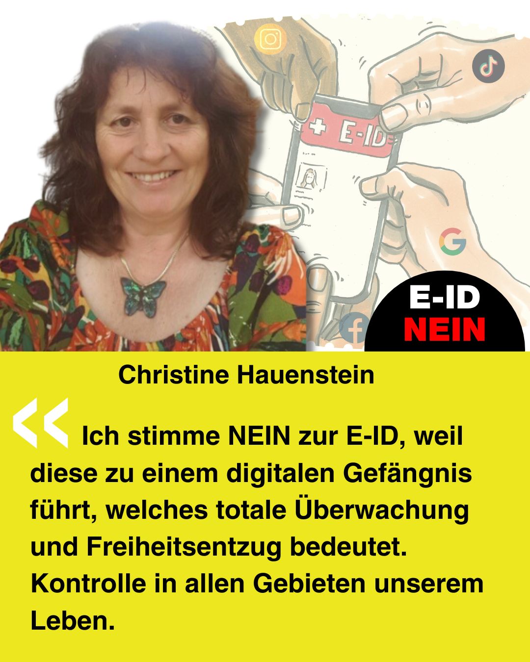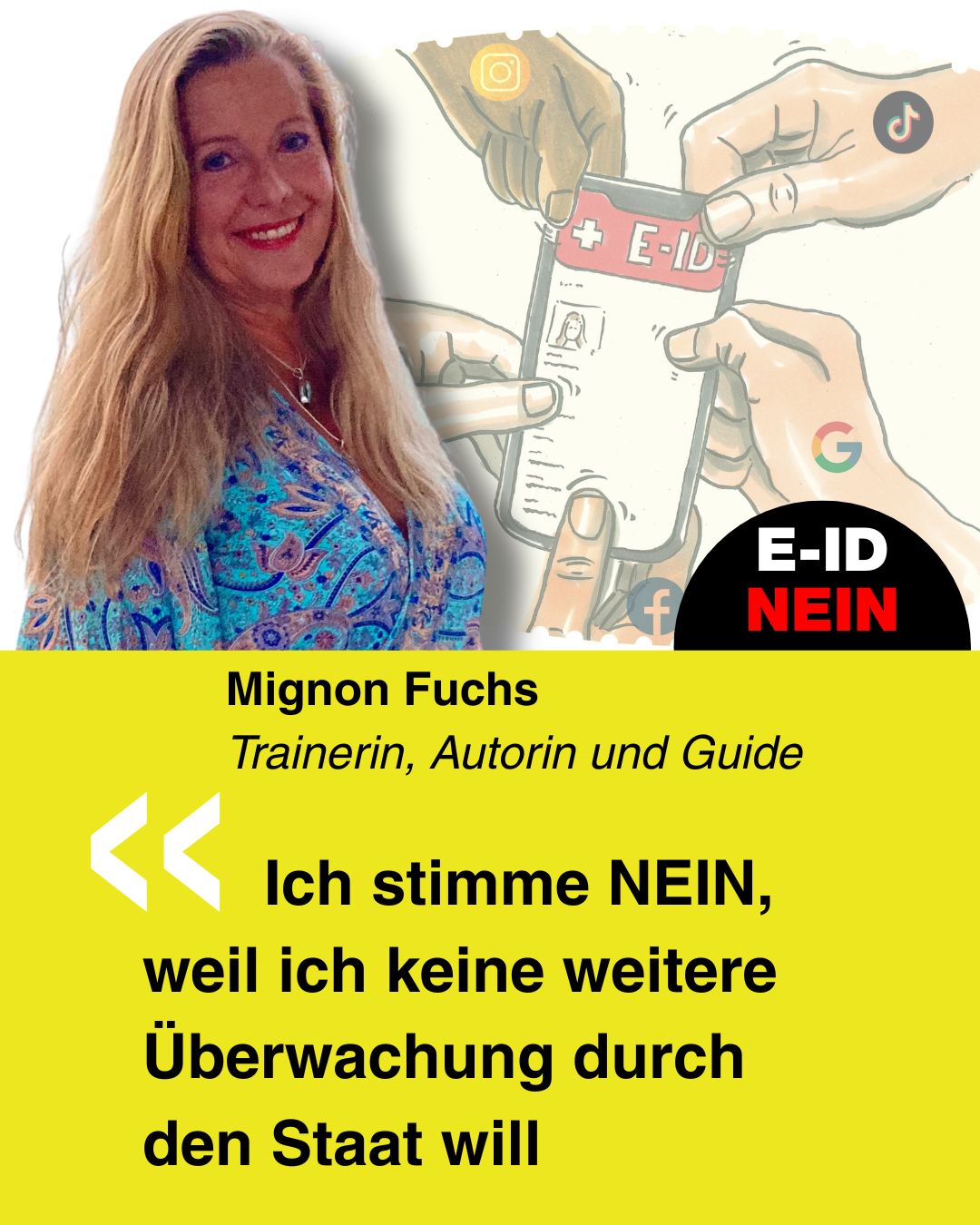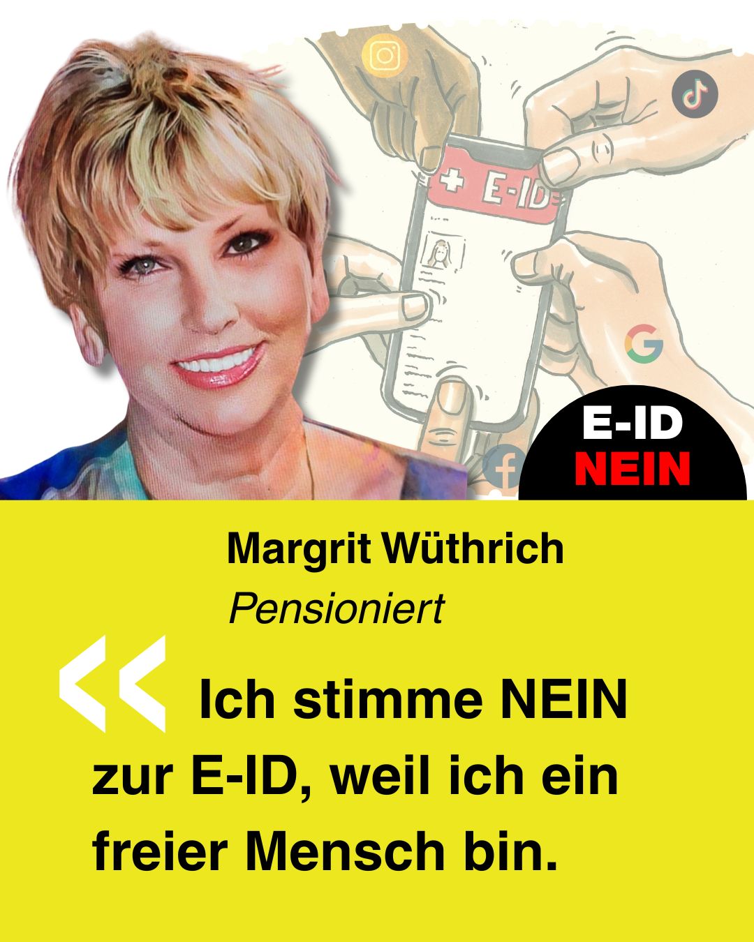 Bekenne Farbe gegen die E-ID. Erstelle Dein ganz persönliches Social-Media-Bild und poste dieses auf Social-Media.