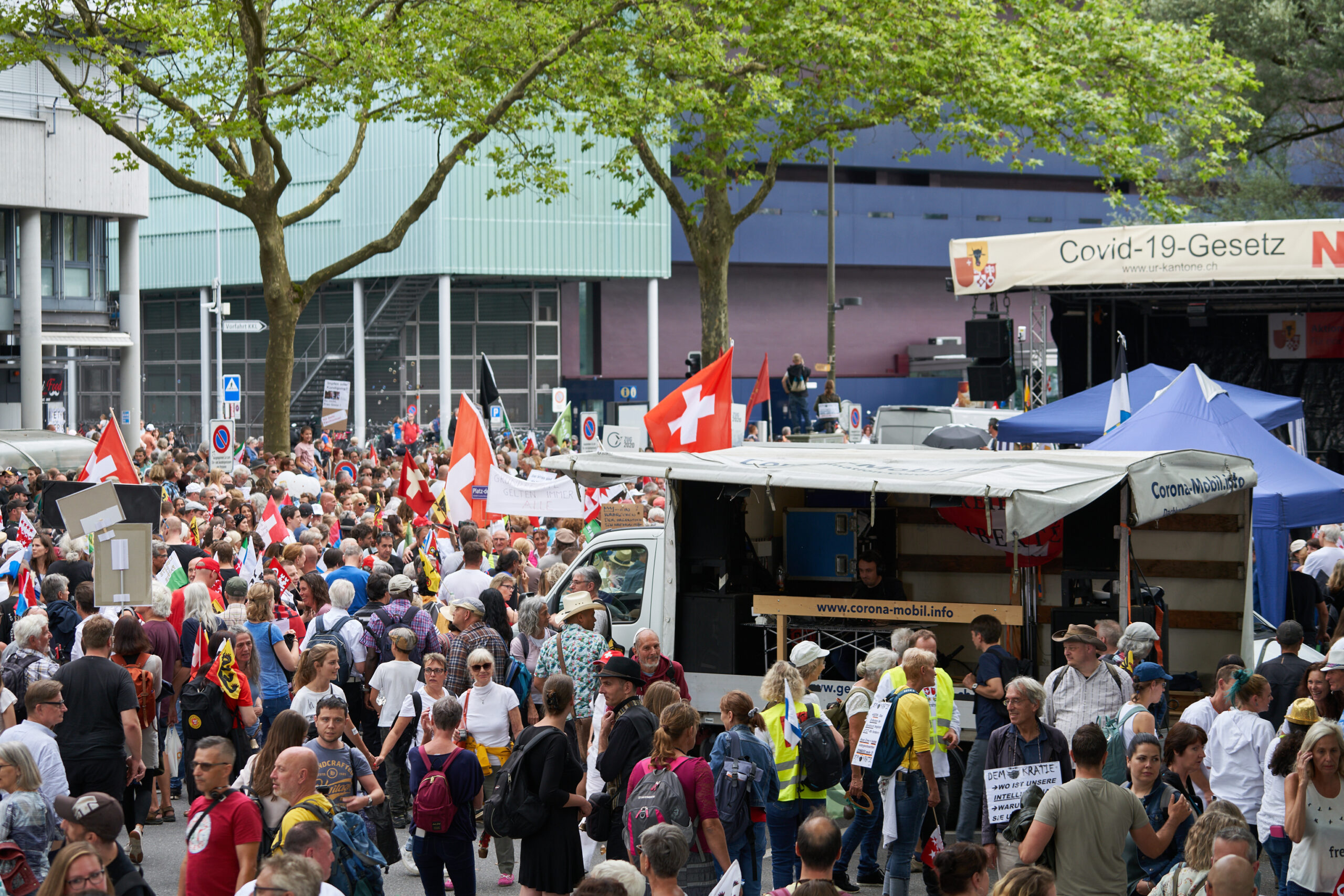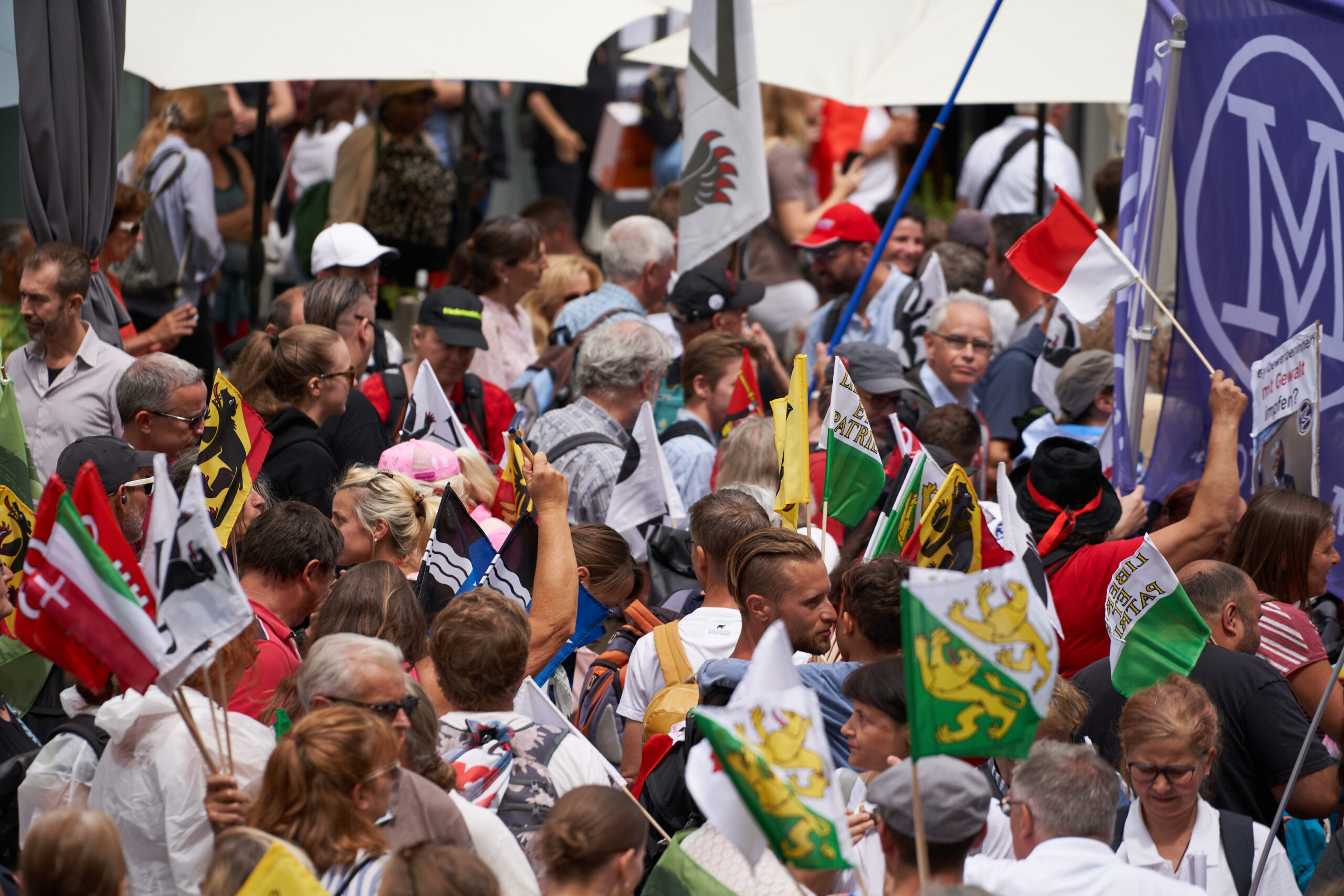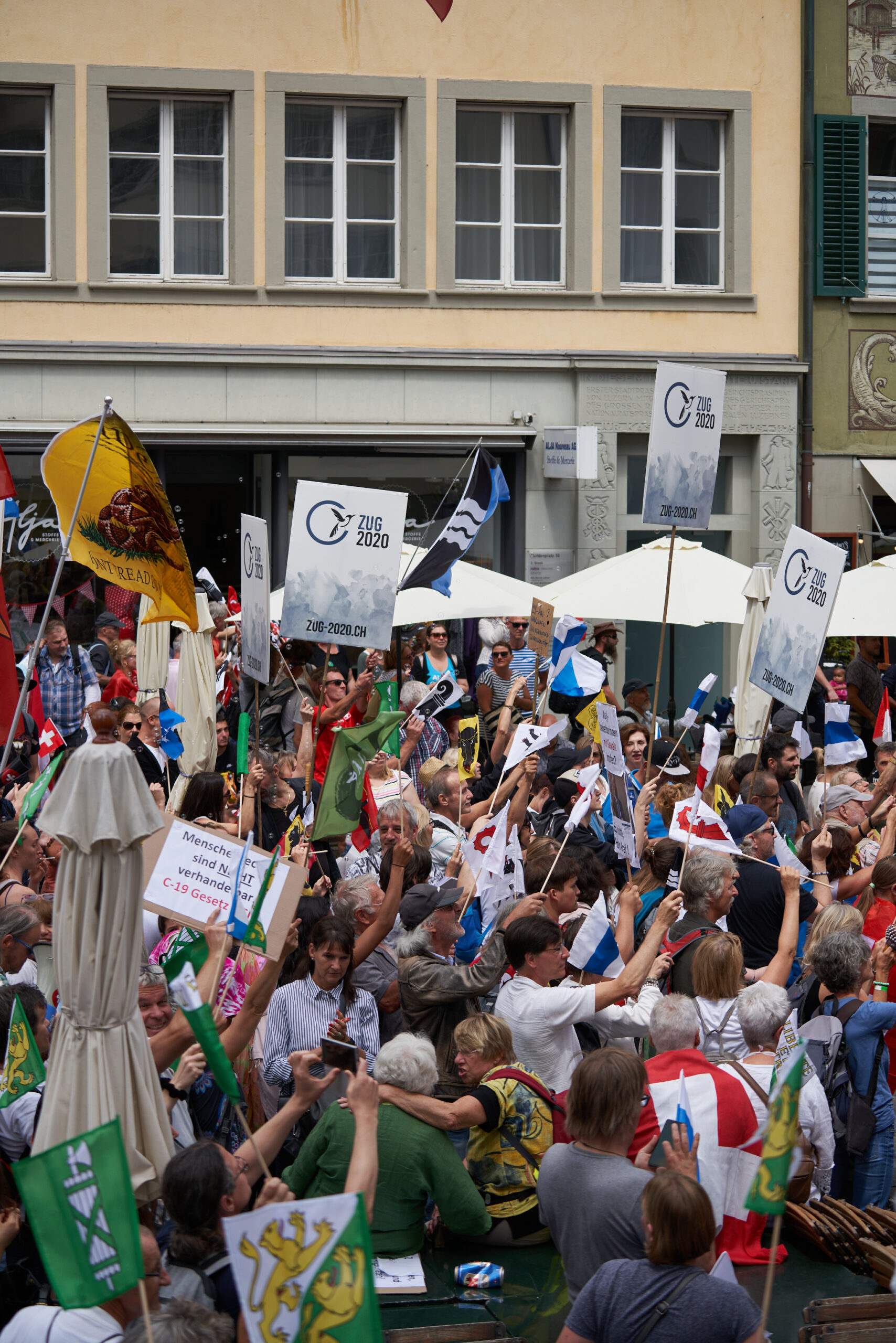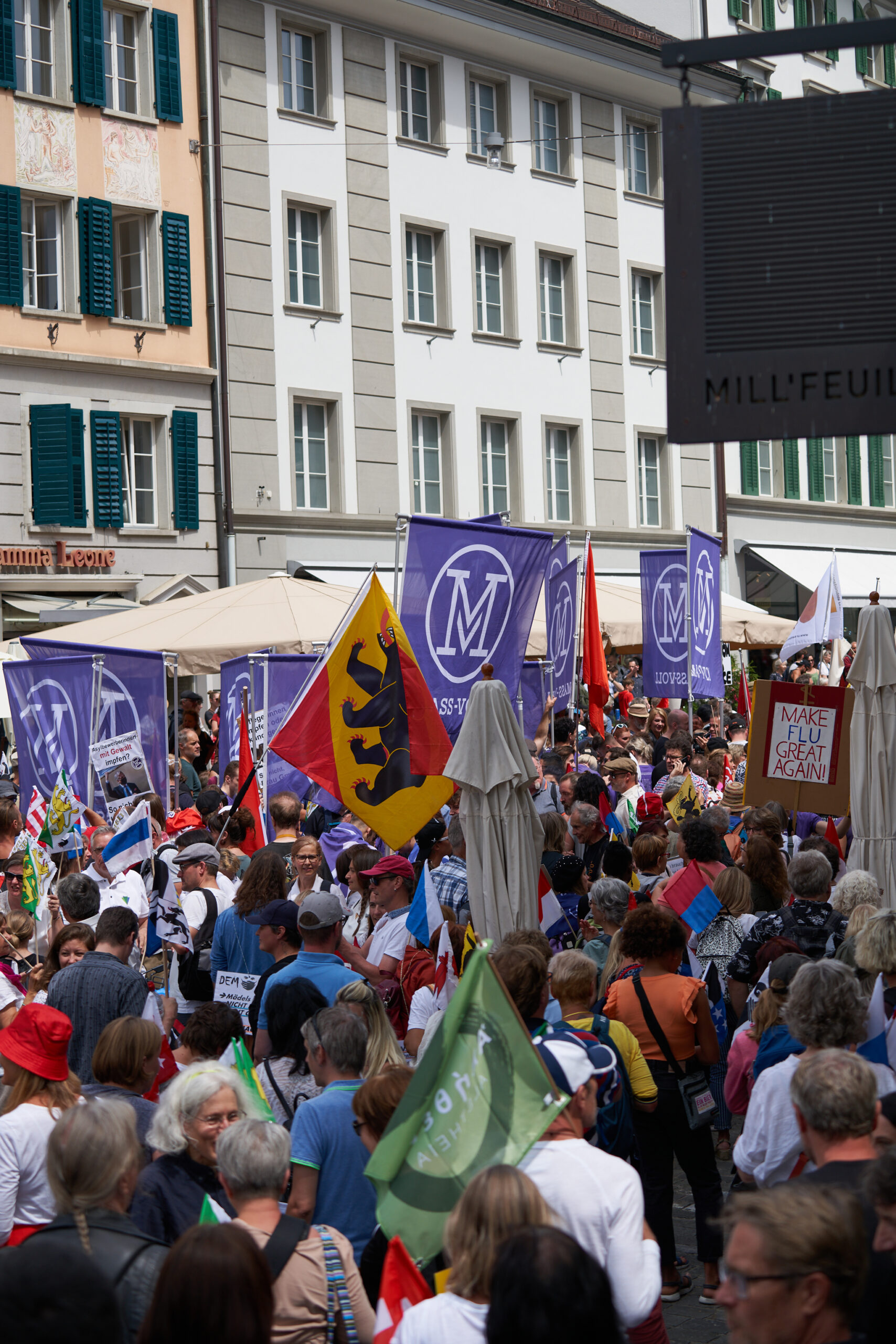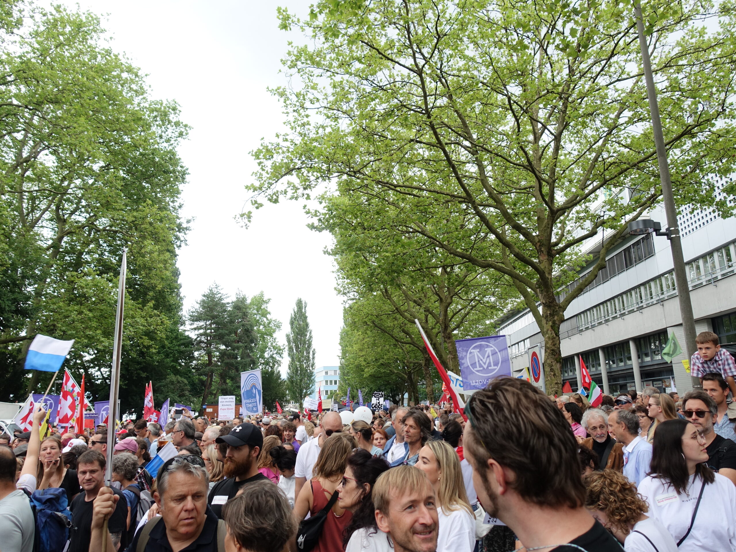 Der Mühlenplatz, von wo aus der Marsch um 14 Uhr startete, war um 13 Uhr schon ziemlich voll mit Menschen und es kamen immer mehr hinzu, aus allen Regionen der Schweiz. Überall sah man selbstbeschriftete Plakate und bunte Fahnen mit den Schweizer Kantonswappen, aber vorallem: