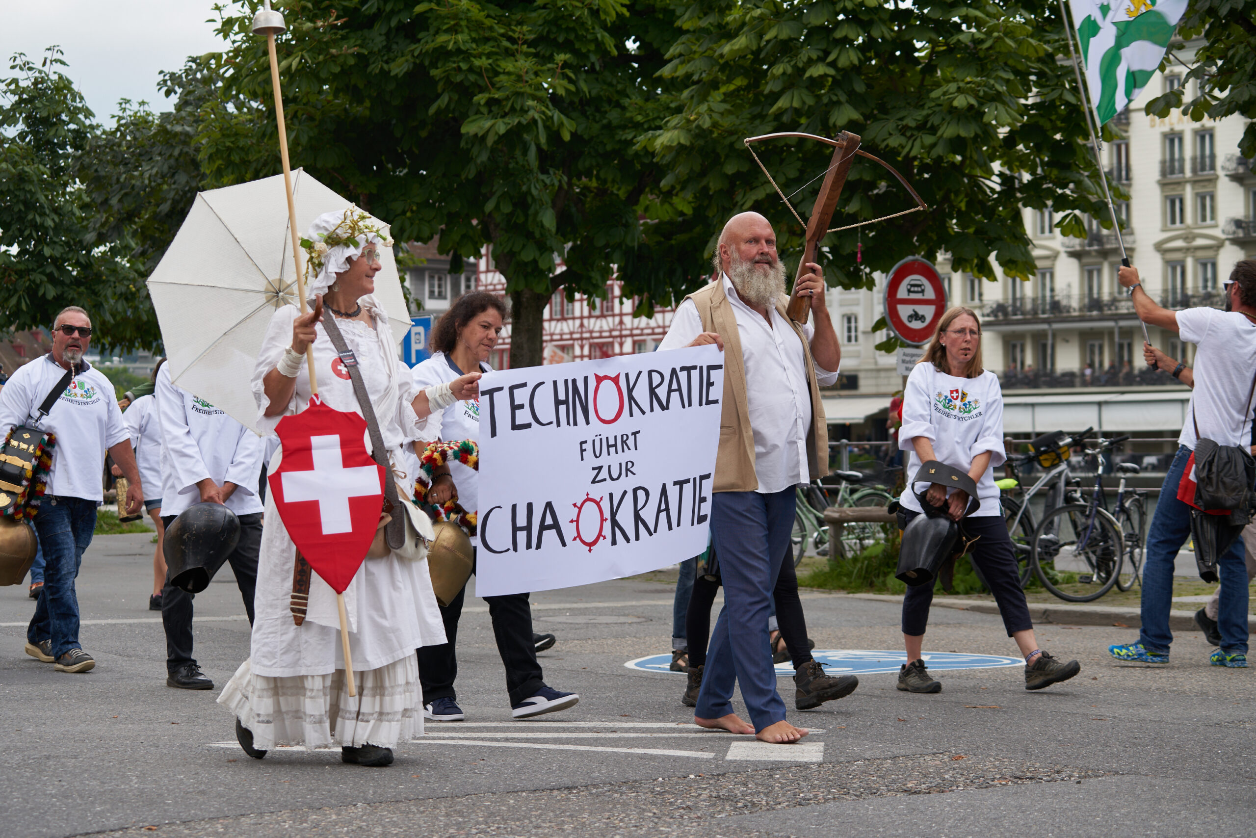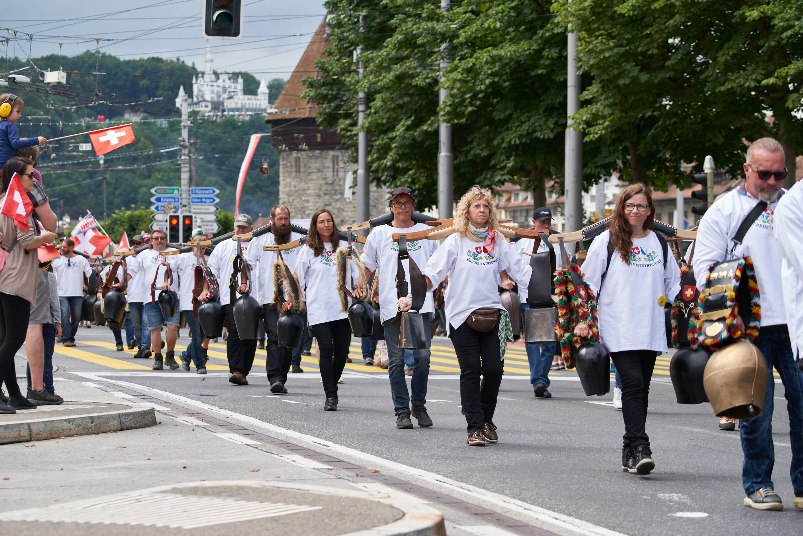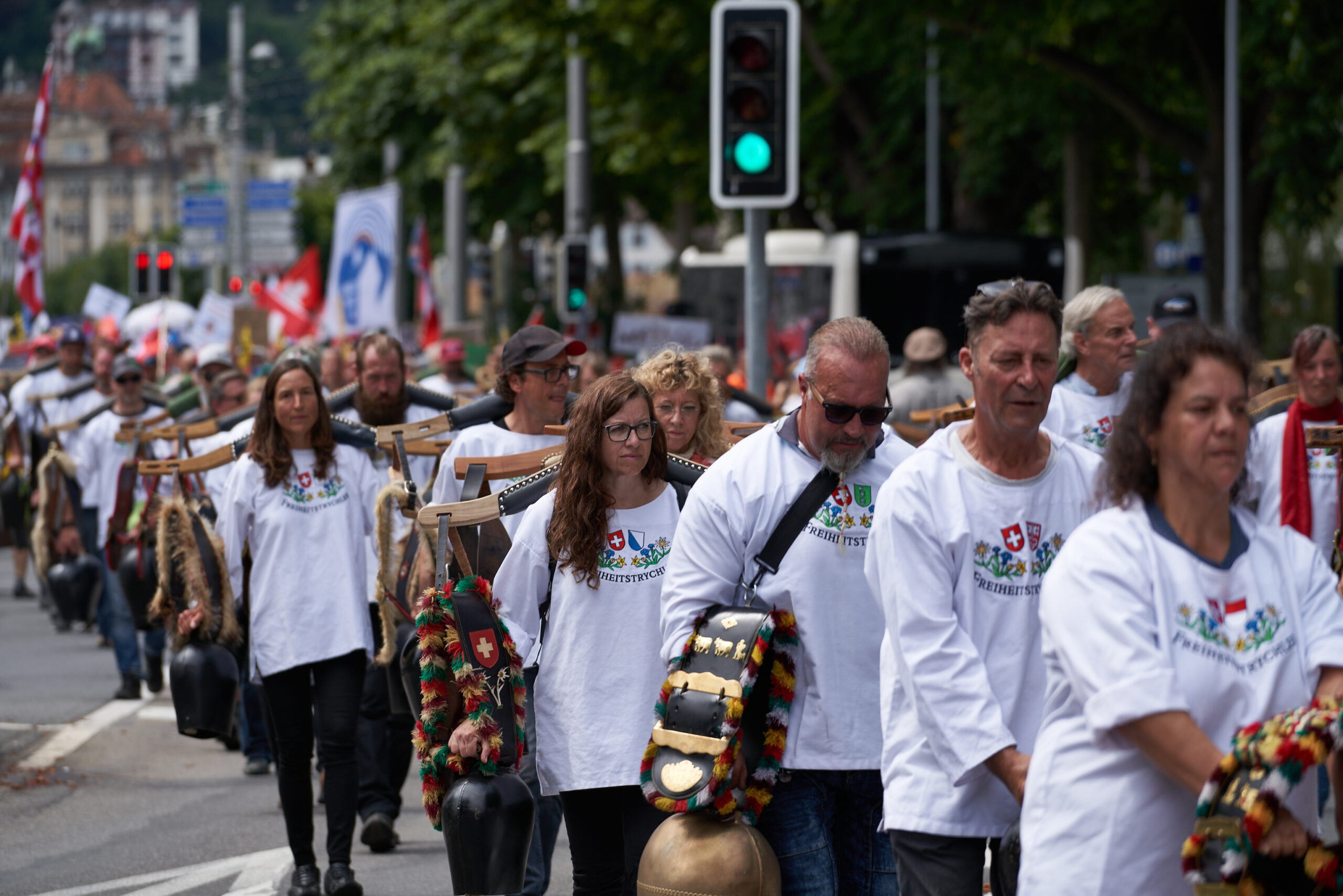 Die Freiheitstrychler sowie auch die Jugendbewegung MASS-VOLL! wurden mit viel Gejubel auf dem Mühlenplatz begrüsst. Kurz vor 14 Uhr war der Platz so voll, dass man fast nicht mehr durchkam. Ein paar Minuten später ging es dann los und die ganze Menschenmasse setzte sich in Bewegung, angeführt von den Freiheitstrychlern.